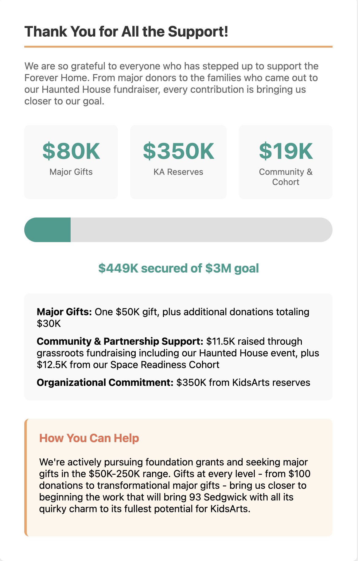 If you're a current KidsArts parent, you know Jenna Figueiredo as the person who keeps everything running smoothly - registration, event reminders, all the logistics that make our programs work. Now she's also on our building committee, coordinating with Ray-ray, architects, builders, and facilities experts to bring this vision to life.