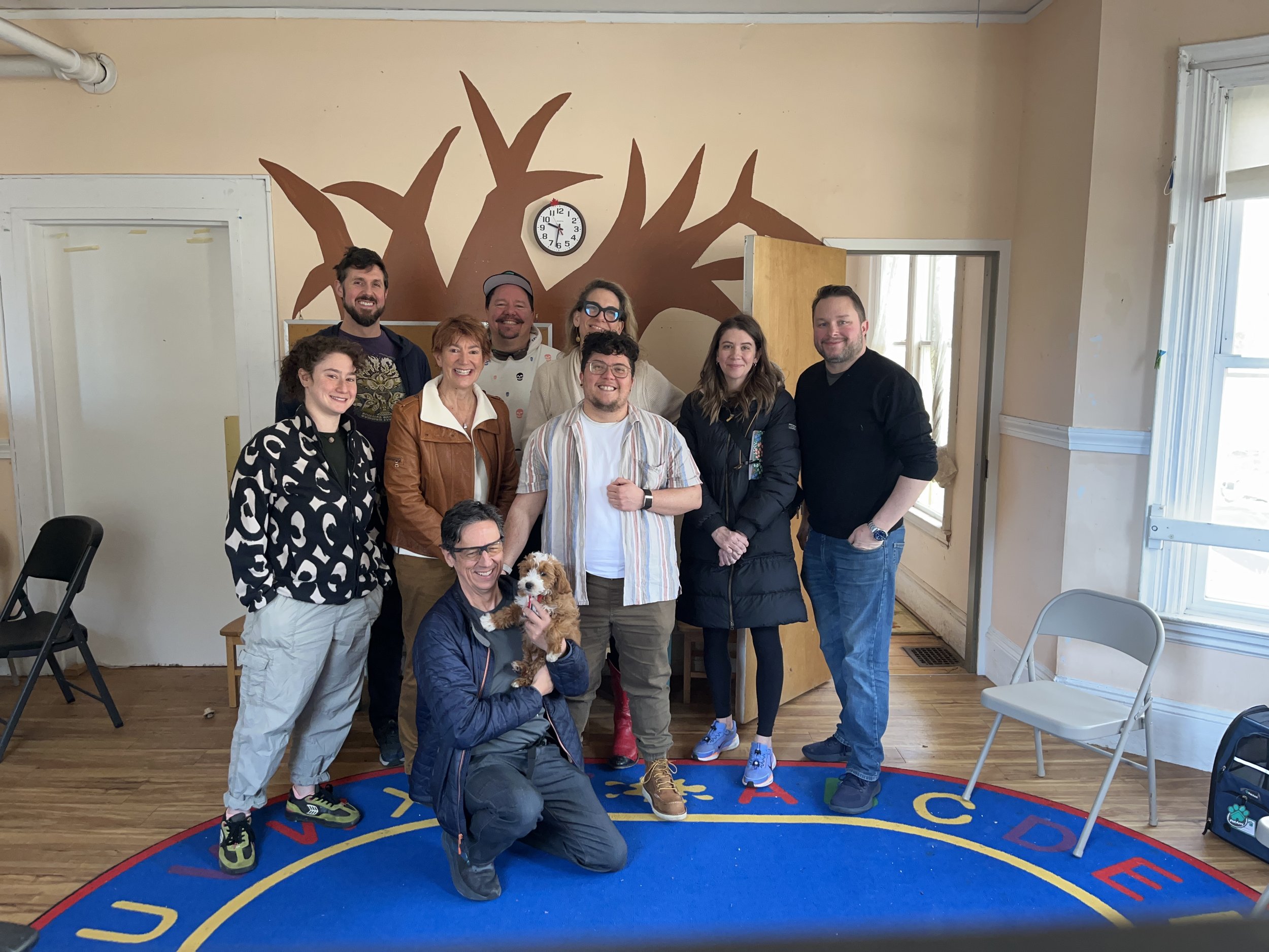From left to right: Talia Rodriguez, Everett Hoffman, Kelly Gaule, Jon McLaughlin (with Noodle), Mike Gusefski, Ray-ray Farrales, Stefanie Shull, Danielle Friend, and Eli Center (not pictured: Gigi Kellett)